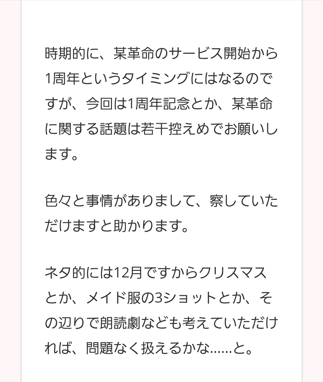 >> 時期的に、某革命のサービス開始から1周年というタイミングにはなるのですが、今回は1周年記念とか、某革命に関する話題は若干控えめでお願いします。
