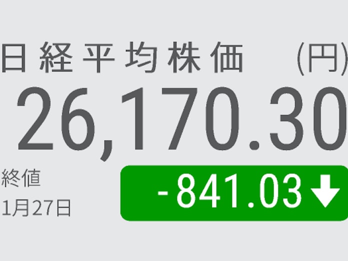 27日の東京株式市場で日経平均株価は大幅に3日続落し、前日比841円03銭(3・11%)安の2万6170円30銭と、連日で昨年来安値を更新した。下げ幅は6日(844円)以来の大きさで、2020年11月以来およそ1年2カ月ぶりの安値水準。米連邦準備理事会(FRB)が26日まで開いた米連邦公開市場委員会(FOMC)を受けて、金融引き締めに積極的なタカ派色が一段と強まることを警戒した売りが膨らんだ。下げ幅は一時900円を超えた。
