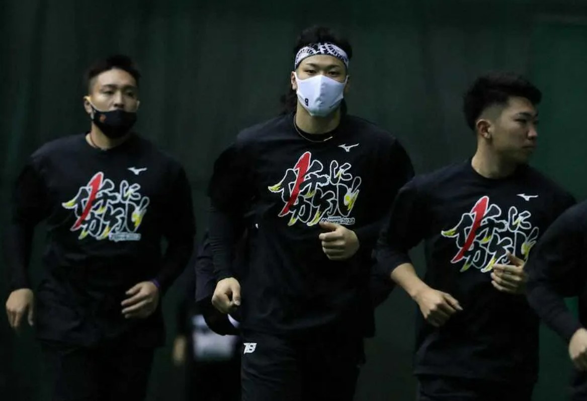 選手は今年のスローガン「イチにカケル」がプリントされたTシャツを着用して室内練習場で練習をスタートさせた。