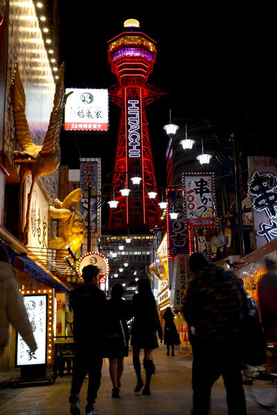 通天閣もすっかり赤点灯…(大阪・新世界周辺、27日)/(C)日刊ゲンダイ
