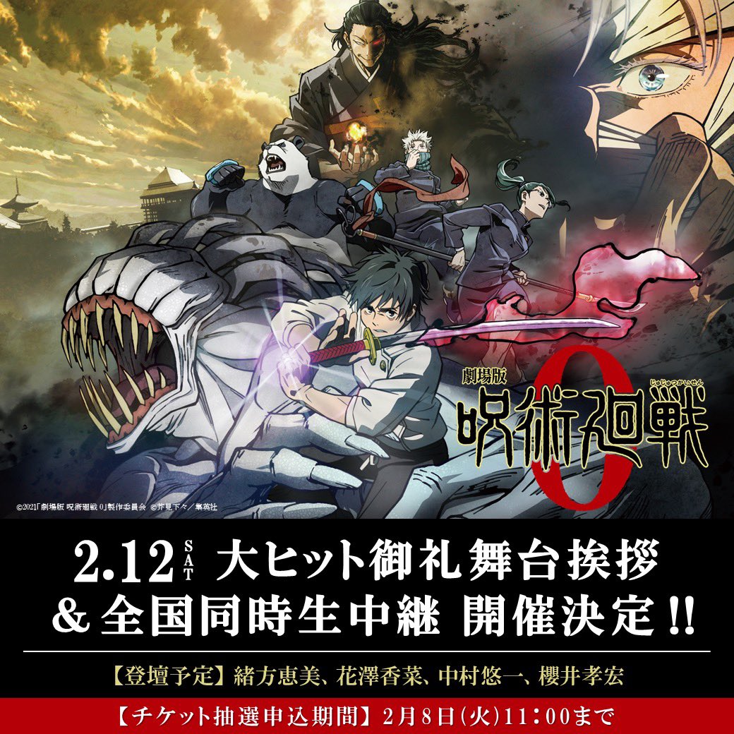 舞台あいさつには、主人公・乙骨優太役の緒方恵美、特級過呪怨霊となったしまったヒロイン・祈本里香役の花澤香菜、最強の呪術師・五条悟役の中村悠一、最悪の呪詛師・夏油傑役の櫻井孝宏が集まり、同作が大ヒットして感じた周囲の反響や、公開後の今だから話せるアフレコ時の舞台裏などを語る。その中で、壇上にて『呪術廻戦』に関する重大発表が行われる。