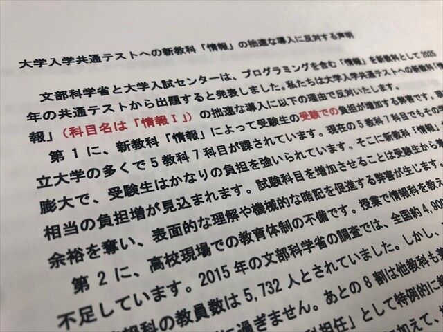 2025年から大学入学共通テストに出題される教科「情報」に関して、大学教授や予備校講師らでつくる「入試改革を考える会」が1月13日、「拙速な導入に反対する」声明文を発表しました。