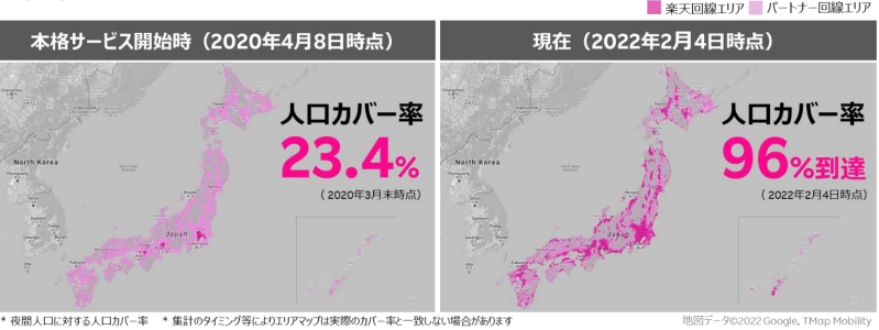楽天モバイルは、同社の自社回線エリア(4G LTE)における人口カバー率が2月4日に96%に達したと発表した。