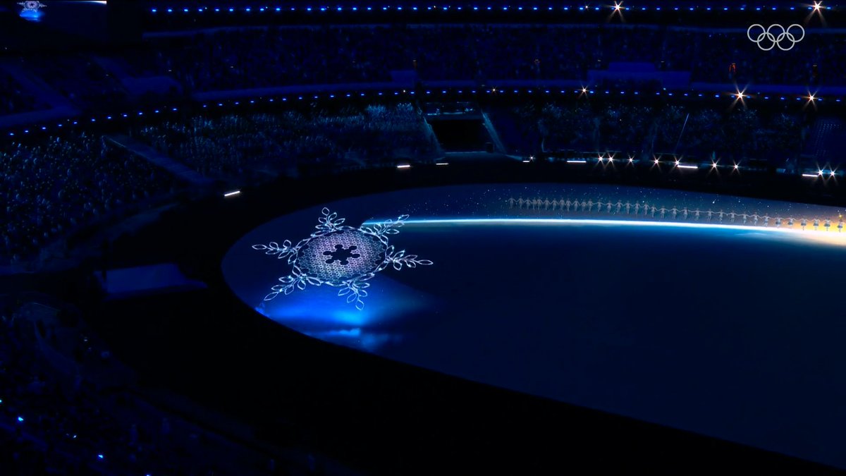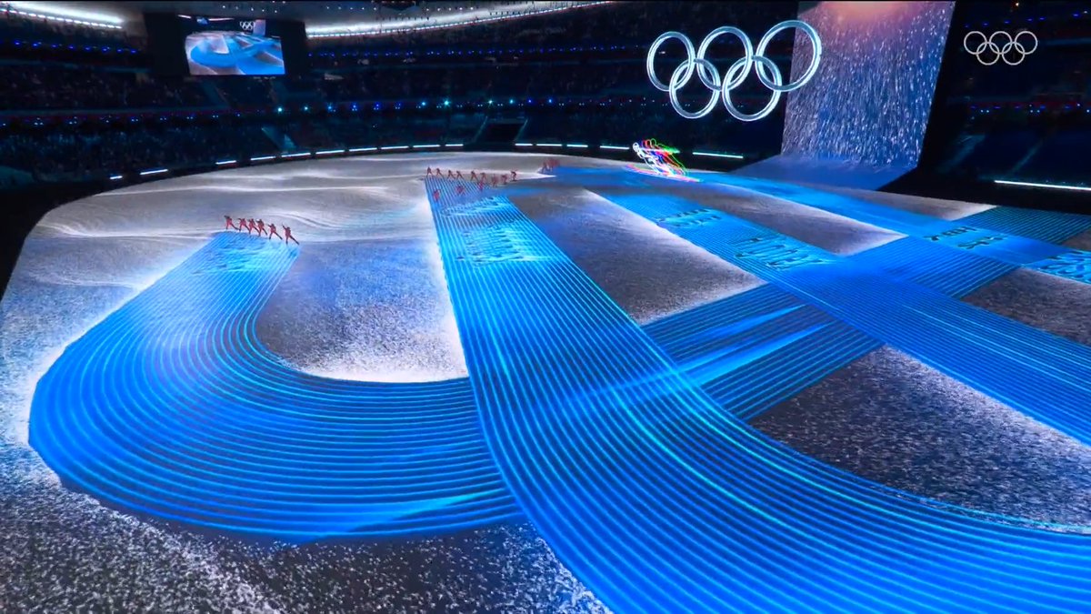 「二十四節気」をテーマにした映像のカウントダウンから開会式が始まると、スタジアム中央では草原が揺れるような視覚演出で、2月4日の「立春」を告げた。スクリーンに映ったたんぽぽの綿毛が舞い上がり、会場の外で花火が打ち上がった。その後も、スタジアム中央に浮き上がった氷から五輪のエンブレムが現れる演出がなされるなど、映像美を活かした仕掛けで会場を盛り上げた。