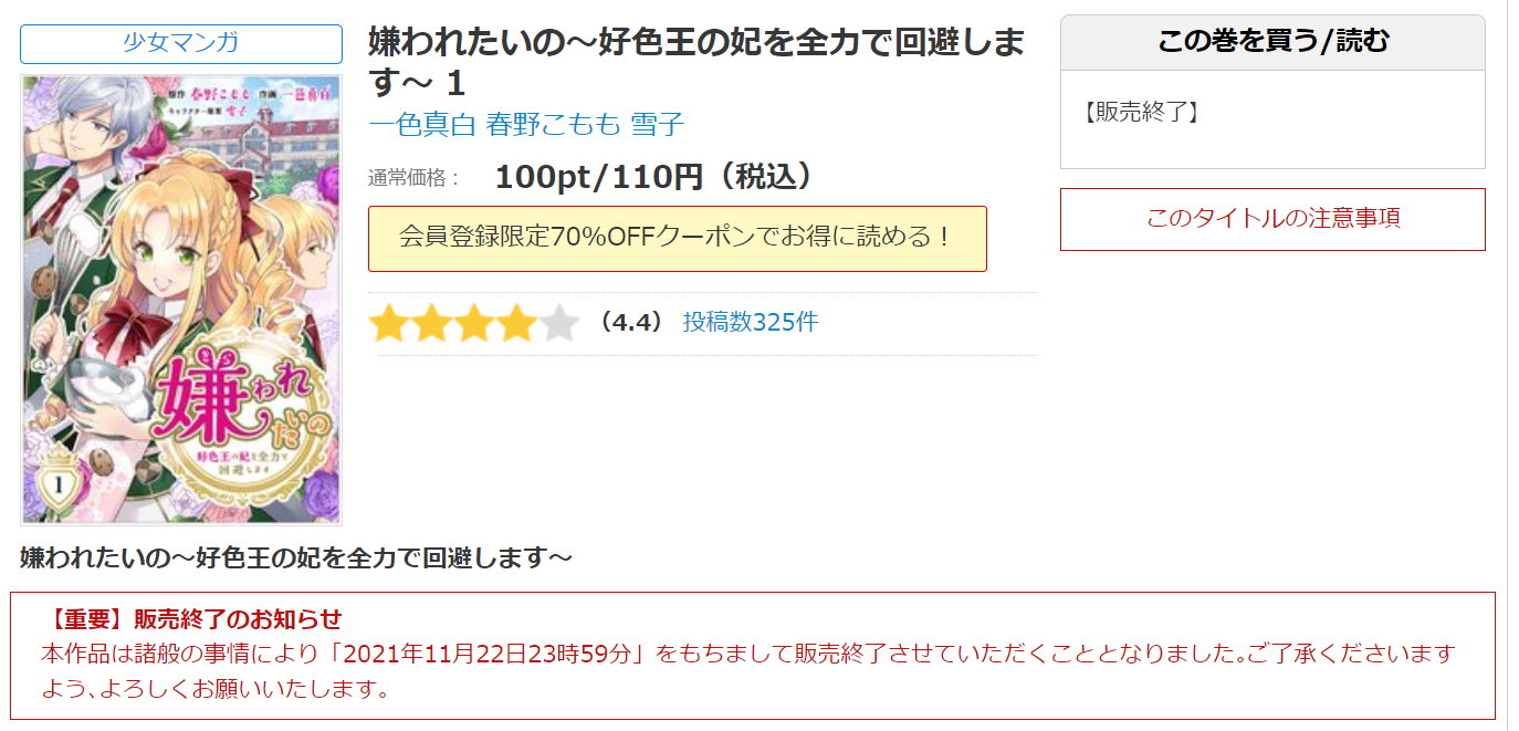 「嫌われたいの~好色王の妃を全力で回避します~」は、小説投稿サイトカクヨムの作品が原作。小説版の作者である春野こももさんや、小説版の単行本のイラストを担当する雪子さんはトレース問題とは関係ないとしており、今後も連載や出荷は続くもよう。