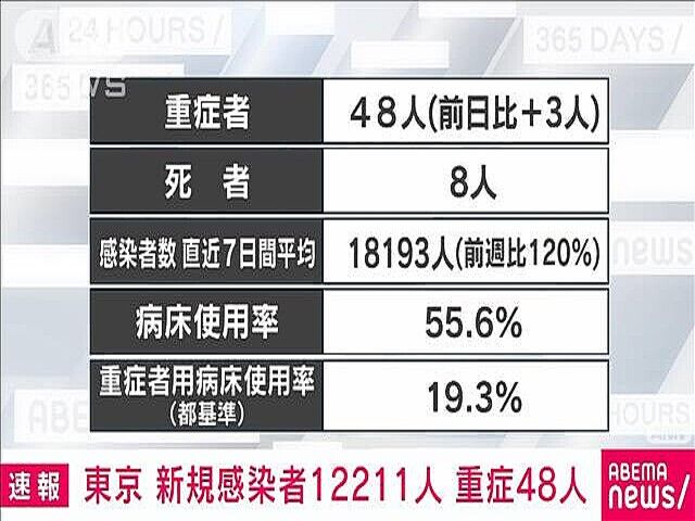 【速報】新型コロナ東京の新規感染12211人 月曜日で過去最多