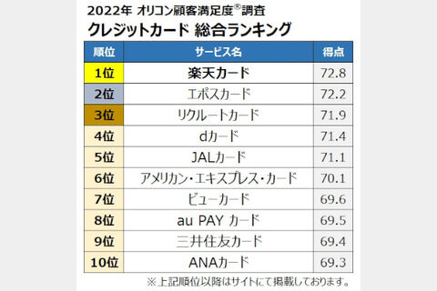 顧客満足度調査を実施するoricon ME(東京都港区)は、クレジットカードに関する満足度調査を実施。その結果、クレジットカード総合ランキングの1位は「楽天カード」、2位は「エポスカード」、3位は「リクルートカード」だった。