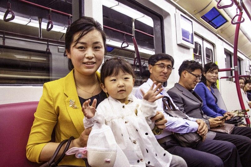 平壌市内の地下鉄車内で、隣に乗り合わせた親子。周囲の乗客たちが優しい眼差しでこちらを見ていた=2019年5月、伊藤孝司さん撮影