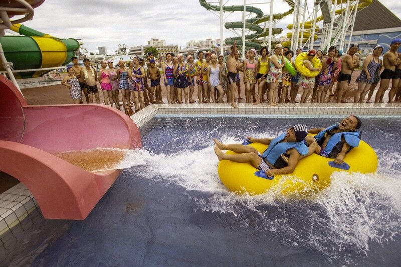 平壌市内にある遊泳場のウォータースライダーには長い行列ができていた。金正恩体制になり、大規模な娯楽施設が次々と建設された=2019年7月、伊藤孝司さん撮影
