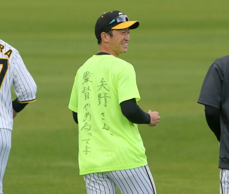練習前、Tシャツの背中に「矢野さん、監督やめるってよ」と書き込み、輪の中に進み出るとナインへ語りかけた。