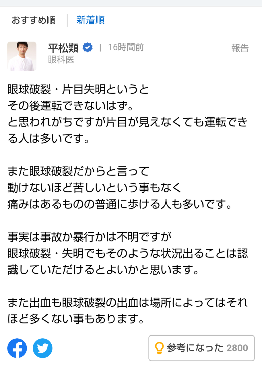 Aさんの治療にあたった医師によると、怪我は右眼球破裂だけではなく、右の頬骨と目の横の骨も骨折、さらに脳内出血もしていたという。