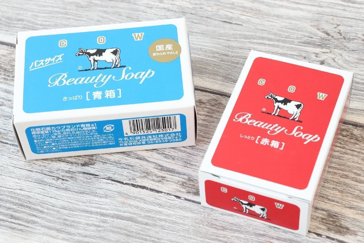 レギュラーサイズ以外にも、「赤箱」には少し大きめサイズの125g「赤箱125」と「ギフト用」があり、「青箱」には大きめサイズの130g「バスサイズ」と「ギフト用」があります。