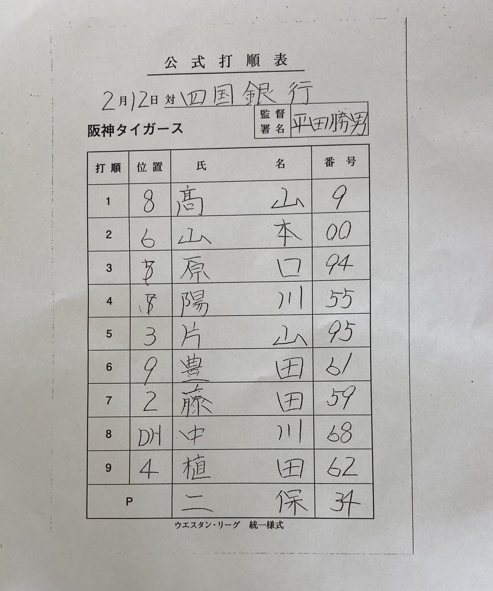 阪神2軍は22年の対外試合初戦を迎える。今季から野手転向する原口が「3番・三塁」で先発。新人ではドラフト6位・豊田(日立製作所)が「6番・右翼」に入り、同7位・中川(京都国際)も「8番・指名打者」に名を連ねた。