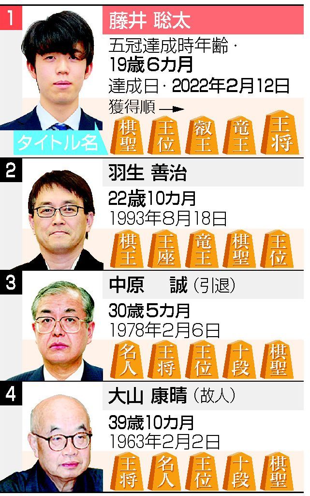 19歳6カ月での五冠達成は羽生善治九段の22歳10カ月を29年ぶりに更新する最年少記録で、初の10代での五冠です。