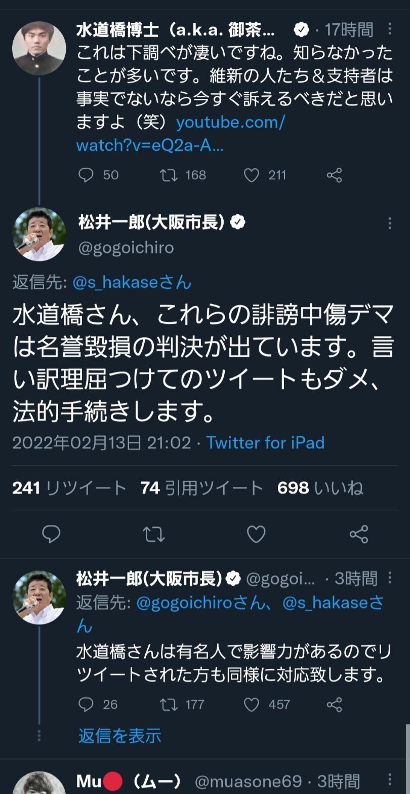 すると、これに反応したのが松井市長だ。「水道橋さん、これらの誹謗中傷デマは名誉毀損の判決が出ています。言い訳理屈つけてのツイートもダメ、法的手続きします」と警告。