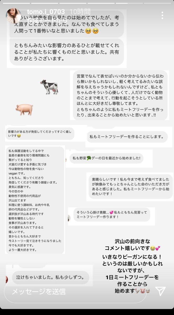 さらに板野の思いに賛同するフォロワーからのコメントを紹介し、「沢山の前向きなコメント嬉しいです」と感謝。「いきなりビーガンになる!というのは厳しいかもしれないですが、1日ミートフリーデーを作ることから始めます」とつづっていた。