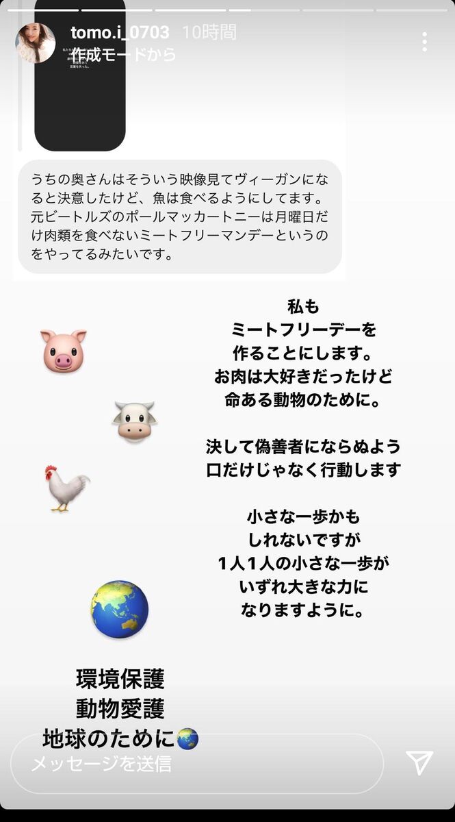 「畜産業をされてる方で、愛情を持って大切に育ててる方もたくさんいると思いますので、畜産業を否定する訳でもないです。ただ、週に1日お肉を減らす日を設けるという事で、今まで当たり前に頂いていた、大切な命にもっと感謝し、見つめ直す日を作るという事です!」と主張し、「私が発信する事で、同じように思ってくれた方が増え小さな行動が、大きな力に変わるといいな…そして、動物の残酷な死が減ったらいいなと思います」と訴えていた。