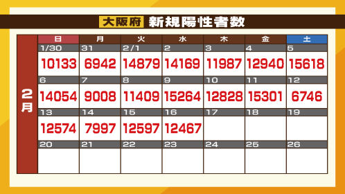 大阪府は16日、新型コロナウイルスの新たな感染者が1万2467人と発表した。