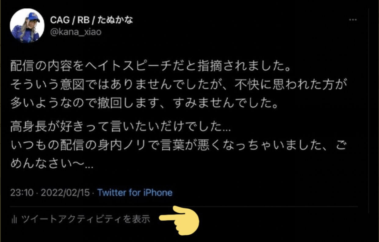 本人にしか表示されない「ツイートアクティビティを表示」が映り込んでいる事で、たぬかな本人の自演レスだったと判明。