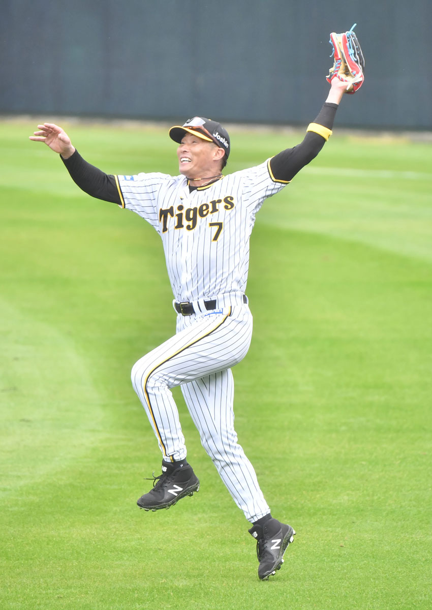今キャンプでは常にフルメニューをこなす超人はこの日、全体練習終了後の「アメリカンノック」にも参加。外野の右翼線から左翼方向へと、全力疾走でノックの打球を追うおなじみのメニューを8本こなし「俺が一番が多かったから。(本数は)クジ引きでね。本当は、16本やったんやけどシニア割引っていうのがあったから、半額セール(笑い)。何気にきついよ」と、超人節を炸裂させた。