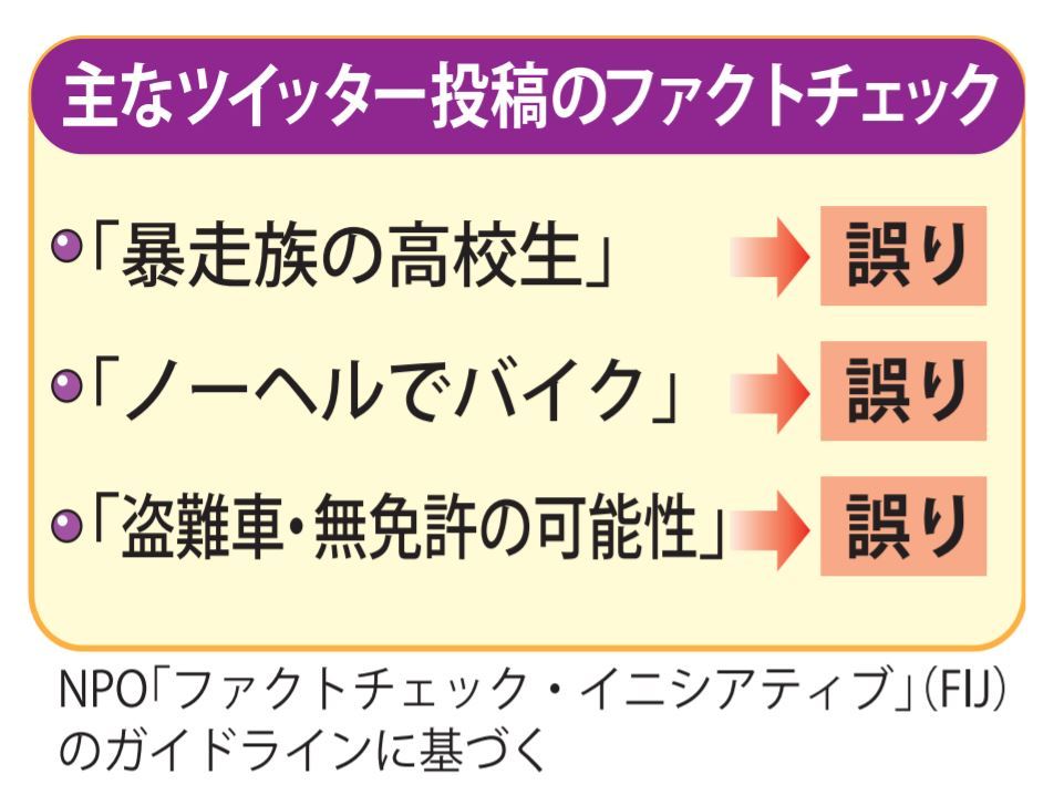 SNSでは発生直後から「沖縄で暴走族の高校生」「そんな時間(深夜)にノーヘルでバイク」「バイク盗難・無免許運転の可能性」など誤った情報が拡散した。