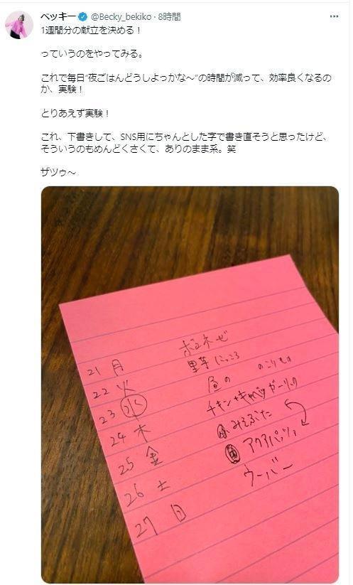 ベッキー 1週間分献立決め実験に反響「日曜ウーバー刺さる」「水曜昼ののこりもの!笑」