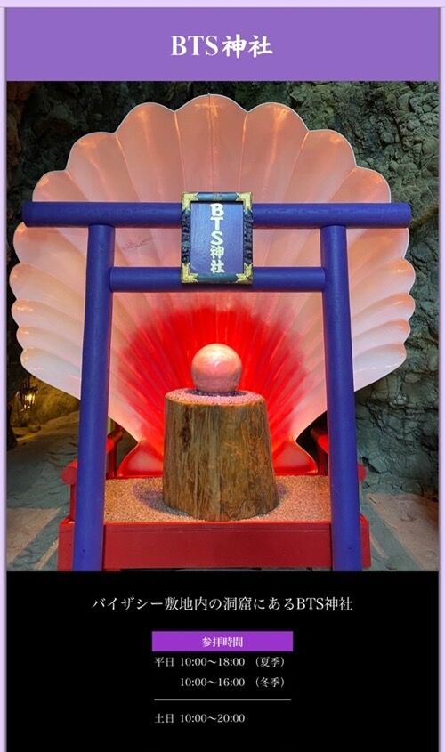 当該神社のホームページには「バイザシー敷地内の洞窟にあるBTS神社」と書かれており、「バイザシー(By the sea=海辺、海岸などの意)」を略して「BTS」としているようだが、