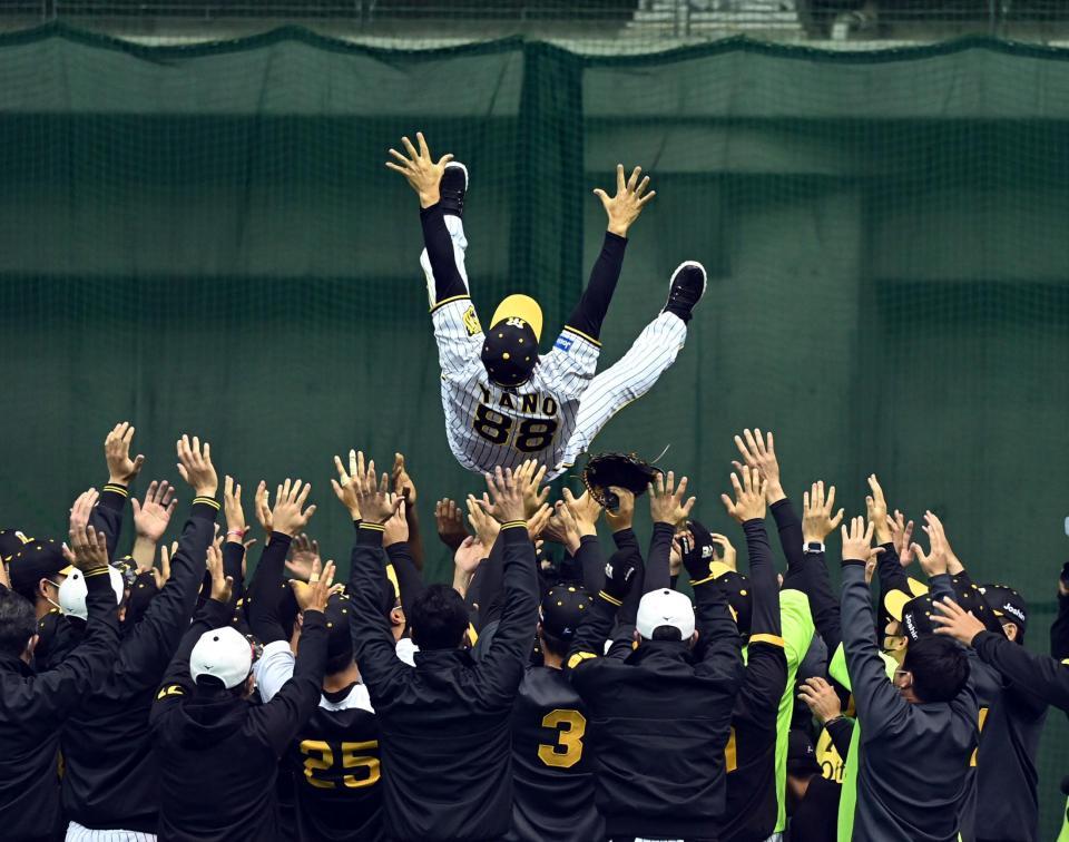 この日のワンデーキャプテンを務める糸井と西勇が音頭を取って、チーム全員で練習前に矢野監督を3度胴上げ。糸井は「胴上げ」と書いたTシャツに袖を通し、同じく西勇は「予祝」と記して円陣の中心に立った。
