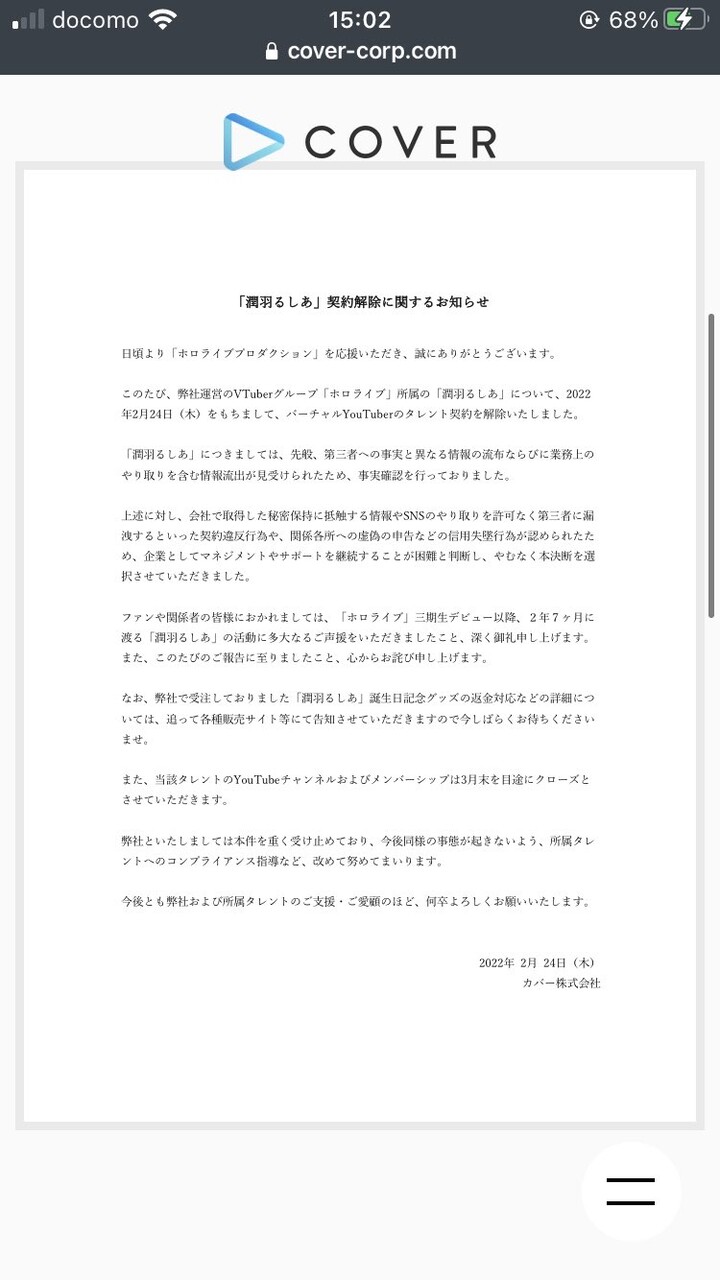 【速報】ホロライブVTuber潤羽るしあさん、契約解除❗❗ “情報漏洩”・”虚偽申告“などの信用失墜行為が認められたため…