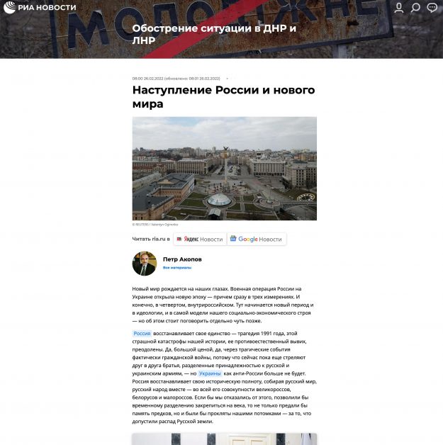 RIAノーボスチ通信が2月26日午前8時(モスクワ時間)にウェブ上で掲載した「ロシアと新たな世界の到来」という署名記事だ。誤配信に気づいたノーボスチ通信はすぐに削除したが、その前に誰かがいち早く保存していた。