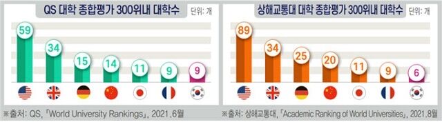 韓国全国経済人連合会がきょう(2日)発表した “韓国大学競争力国際比較”によると、英国のグローバル大学評価機関“クアクアレリ・シモンズ(QS)”の 「QS世界大学ランキング」と中国上海交通大学の「世界大学学術ランキング」の総合順位300位内の大学を分析した結果、韓国は9校がランクインし、主要7か国(米国・英国・ドイツ・中国・日本・フランス・韓国)の中で最も少ないことがわかった。