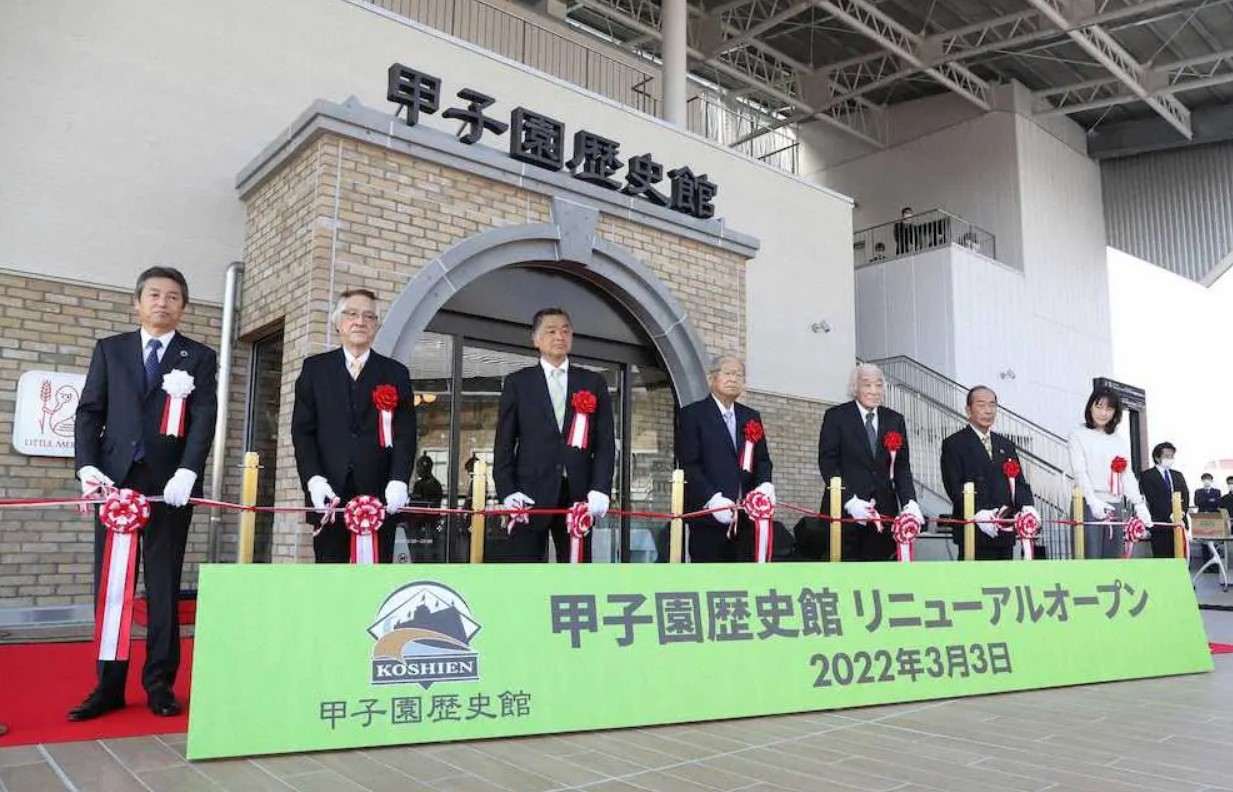 甲子園歴史館が3日、リニューアルオープンし、オープニングセレモニーに歴史館運営会議顧問の阪神OB・吉田義男氏、イラストレーターの成瀬國晴氏らが参加してテープカットを行った。