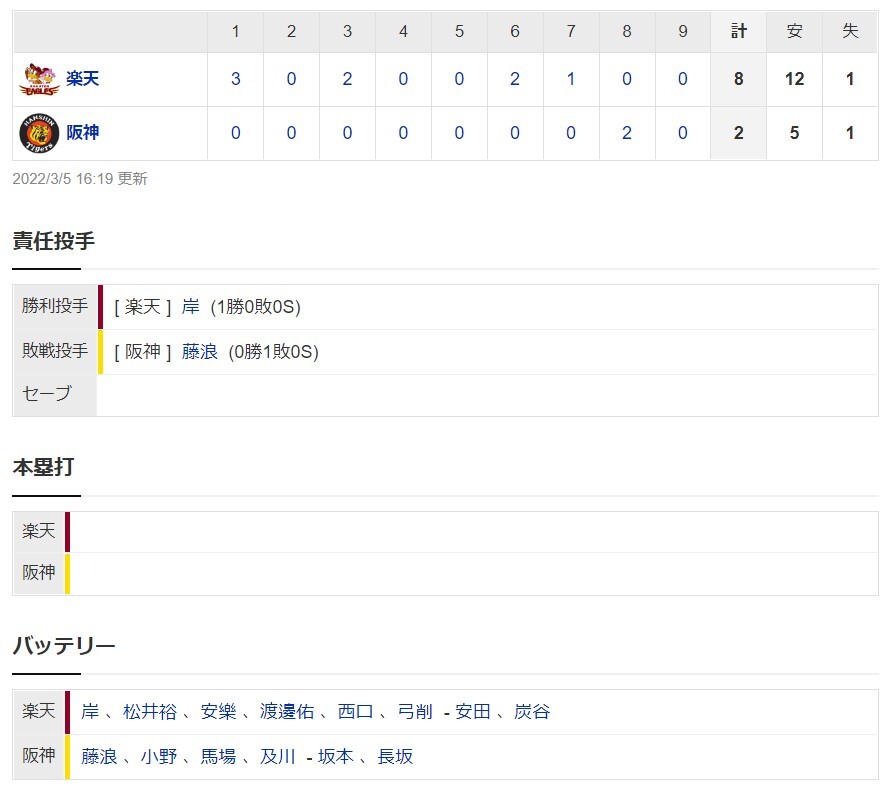 【オープン戦】阪神2ー8楽天 試合結果 甲子園球場 2022/3/5