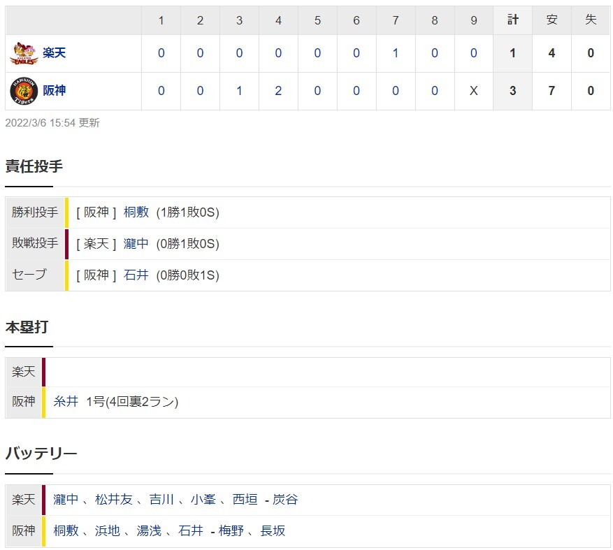 【オープン戦】阪神3ー1楽天 試合結果 甲子園球場 2022/3/6