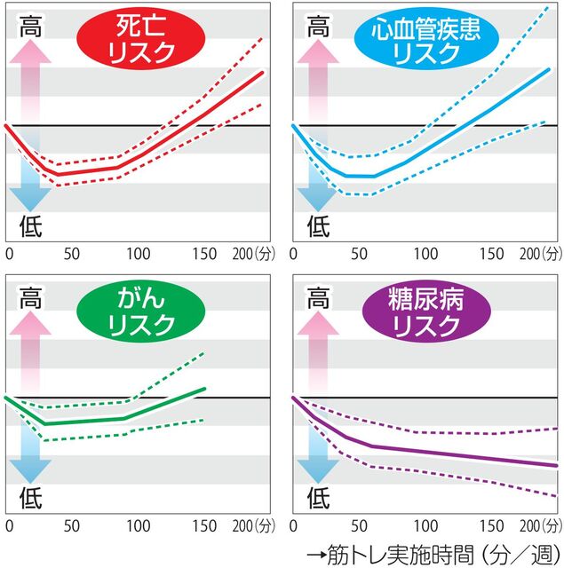 一方、筋トレの実施時間が週130~140分を超えると、逆にリスクが増加に転じることも分かった。糖尿病だけは例外で、実施時間が長いほどリスクが減少する方向に作用した。
