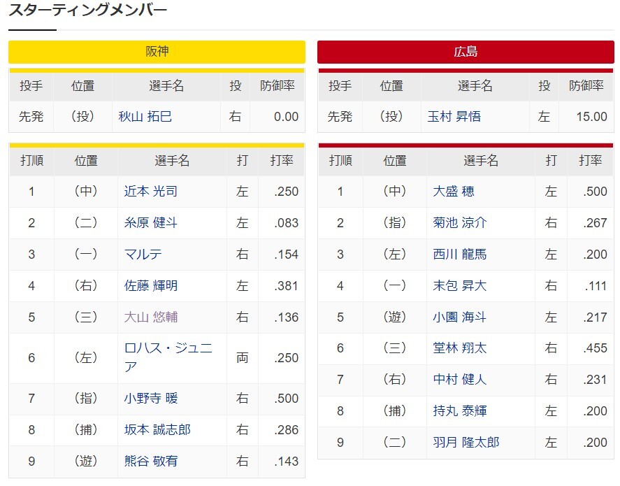 【オープン戦】阪神ー広島 スタメン 甲子園球場 2022/3/9
