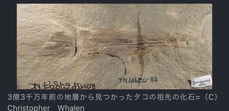 約3億3千万年前のタコの祖先の化石が米国で発見された。吸盤を持つ腕を発達させたコウモリダコやタコの仲間の新種で、タコの起源に迫る発見だという。論文の投稿時に就任したバイデン大統領の名前にちなみ、「シリプシモポディ・バイデニ(Syllipsimopodi bideni)」と命名された。