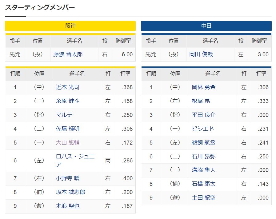 【オープン戦】阪神ー中日 スタメン 甲子園球場 2022/3/12