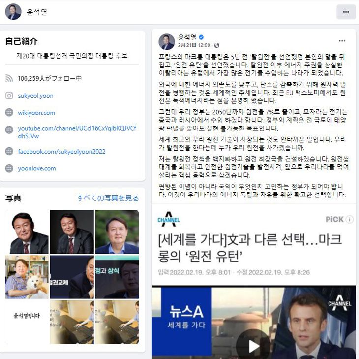 原子力政策を転換し「最強国」を目指すと訴えた尹錫悦氏の投稿(Facebookから)
