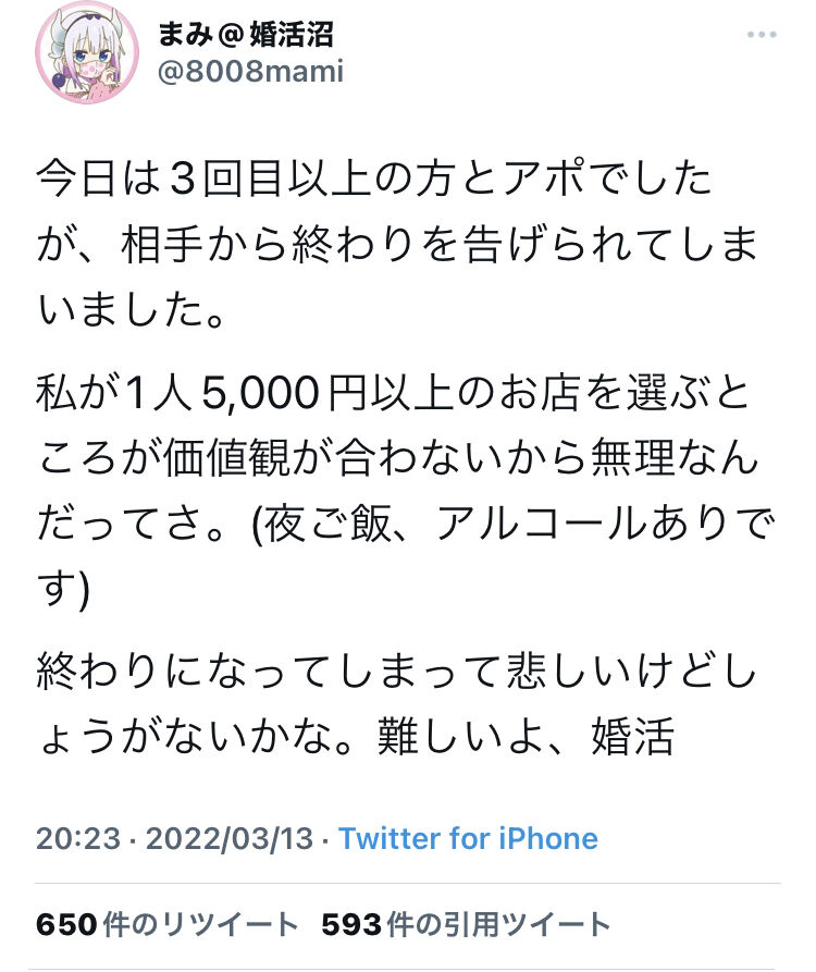 (出典 【悲報】婚活女子さん、毎回1人5000円以上の店を選び別れを告げられる…)