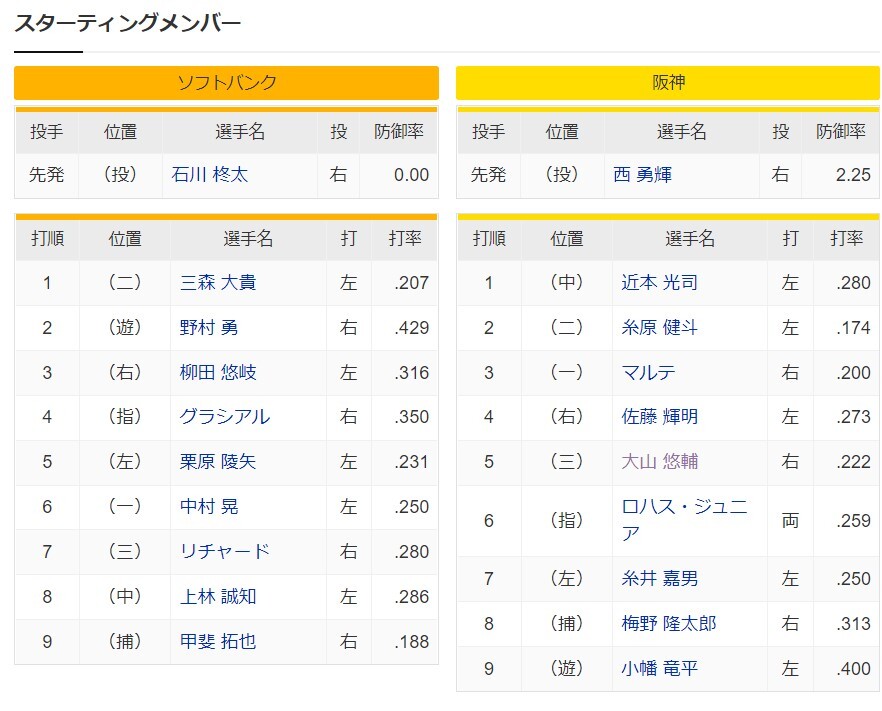 【オープン戦】ソフトバンクー阪神 スタメン PayPayドーム 2022/3/15