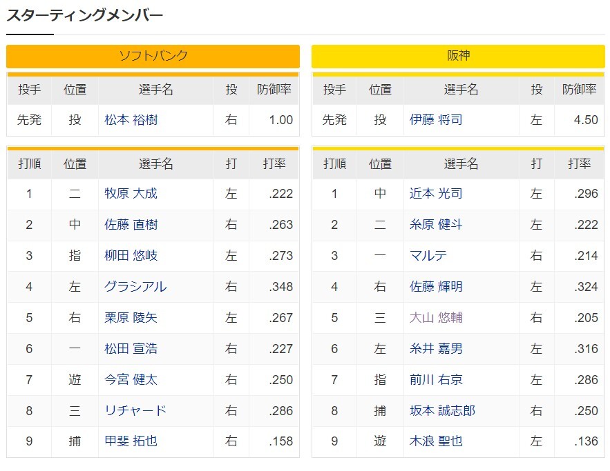 【オープン戦】ソフトバンクー阪神 スタメン paypayドーム 2022/3/16