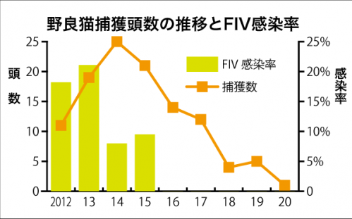 2004年から始まった野良猫の捕獲は05年度に169頭と最多を記録したが徐々に減少。ここ10年では14年度の25頭をピークに20年度は1頭が捕獲されたのみだった。