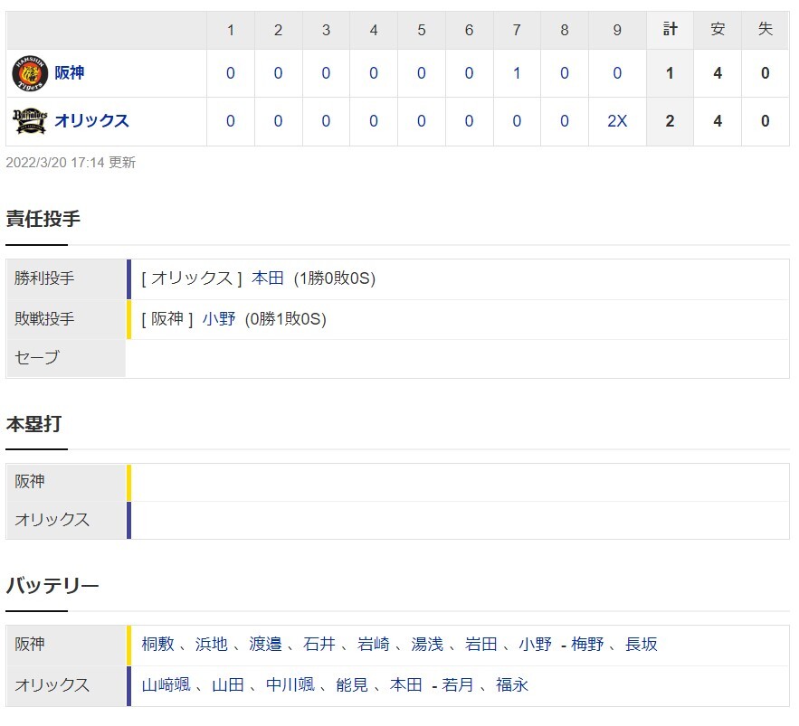 【オープン戦】オリックス2ー1阪神 試合結果 京セラドーム大阪 2022/3/20
