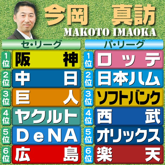 25日に開幕するプロ野球。日刊スポーツ評論家が順位予想をしました。今岡真訪氏のセ・リーグ予想は以下の通り。
