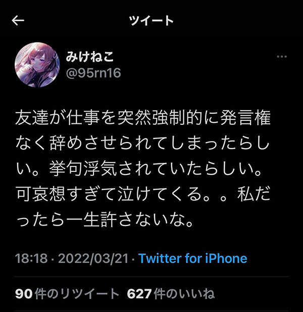 【話題】みけねこさんが意味深投稿「友達が仕事を強制的に辞めさせられ浮気された。可哀想すぎて泣けてくる。一生許さない」