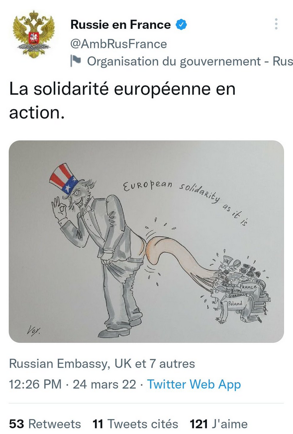 Ces deux caricatures tweetées hier par le compte officiel de l’ambassade de Russie en France (puis supprimées) sont jugées “inacceptables” par le ministère des Affaires étrangères, qui a convoqué l’ambassadeur. (#AFP)