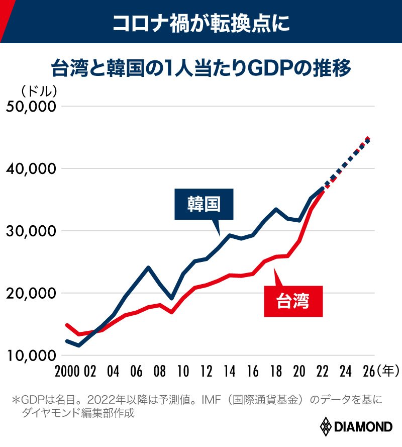 台湾の1人当たりGDP(国内総生産、名目)は2003年に韓国に逆転されて以来、追い付くことができない状態が長く続いてきた。その状況がここにきて、大きく変化している。国際通貨基金(IMF)の推計によると、台湾の1人当たりGDPは3年後の25年に4万2801ドルに達し、韓国の4万2719ドルを小幅で上回る見通しだ。
