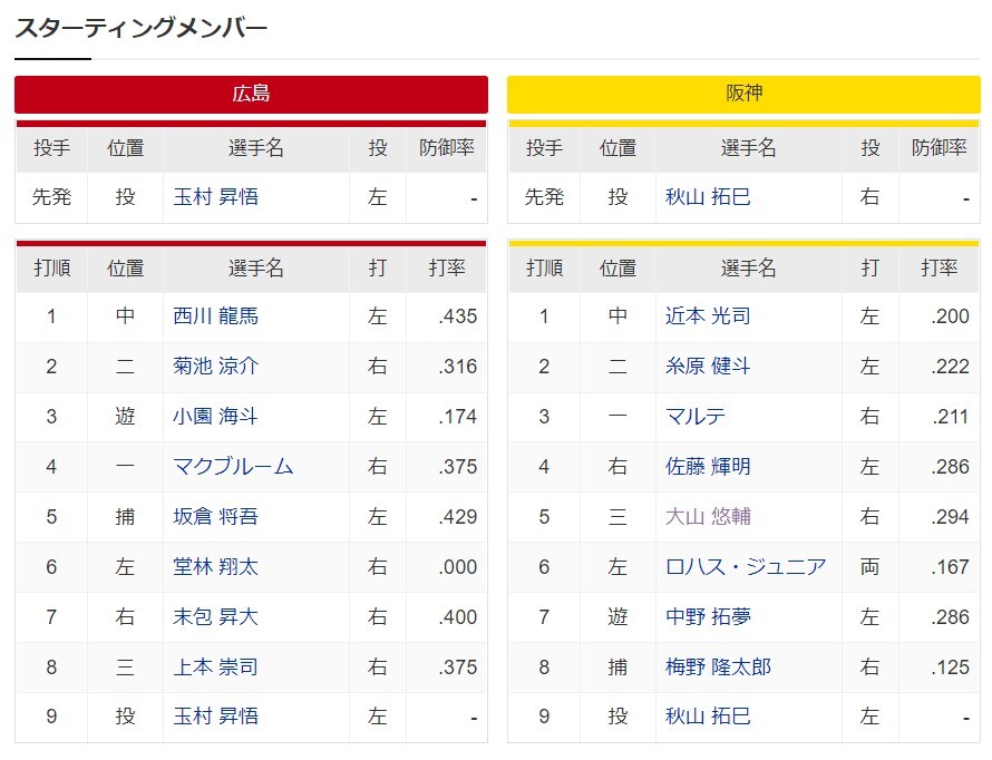 広島ー阪神 スタメン マツダスタジアム 2022/3/31