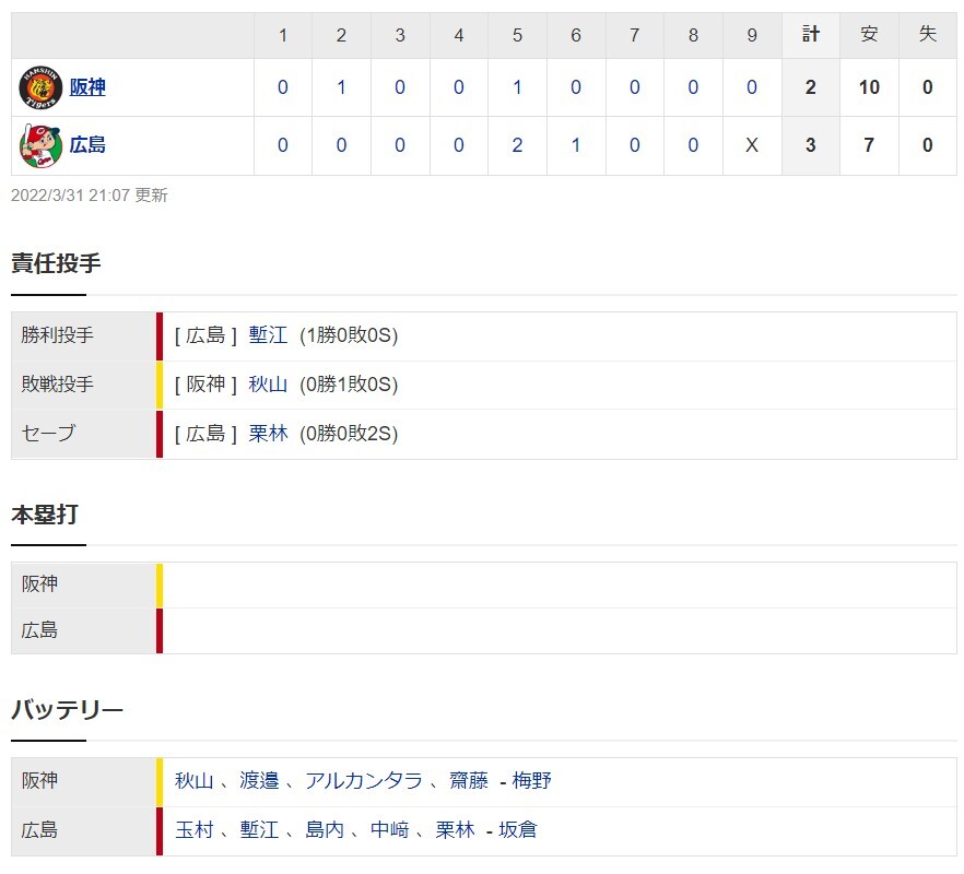 広島3ー2阪神 試合結果 マツダスタジアム 2022/3/31